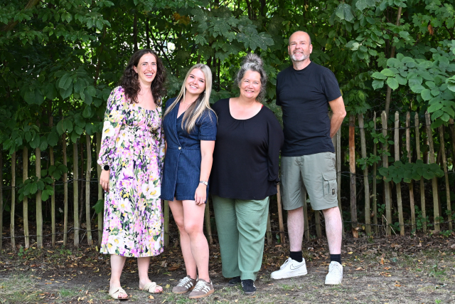 Van links naar rechts: juf Marieke (onderwijsassistente), juf Casey (onderwijsassistente), juf Linda (onderwijsassistente), meester Joris (conciërge)